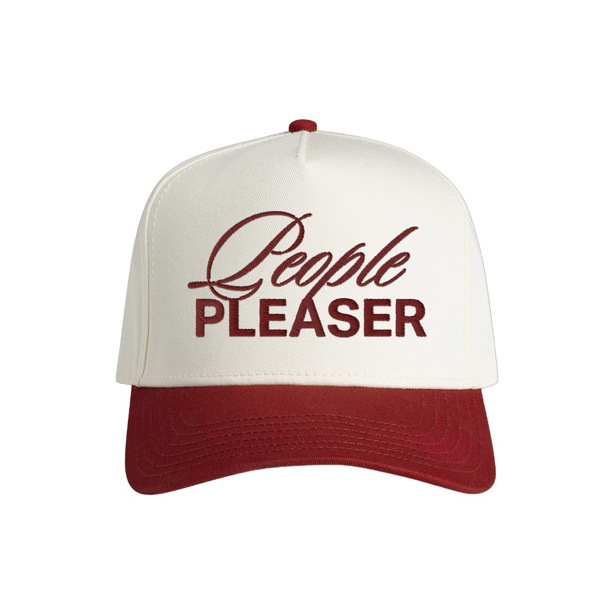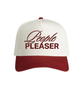 "People Pleaser" embroidered on front of a two-tone natural and cardinal color hat.