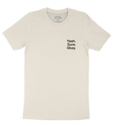 Yeah. Sure. Okay. printed on front a tan t-shirt. Kelsea Ballerini logo on back of neck.