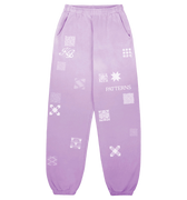 PATTERNS all over print logo on purple tie dye sweatpants.