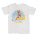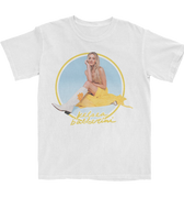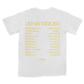 Kelsea Ballerini wearing a yellow dress with boots photo printed on front and 2023 tour dates printed on back of a white unisex t-shirt.