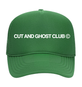 CUT AND GHOST CLUB© printed on a green trucker hat.